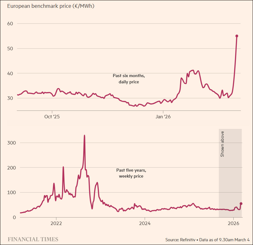 【文/观察者网 陈思佳】随着中东地区局势升级,霍尔木兹海峡航运停摆,中东的石油和液化天然气出口遭遇严重干扰。据英国《金融时报》3月5日报道,中东冲突使得欧洲面临俄乌冲突以来的新一轮能源危机,欧洲天然气价格已上涨53%,可能陷入天然气储备枯竭的困境。